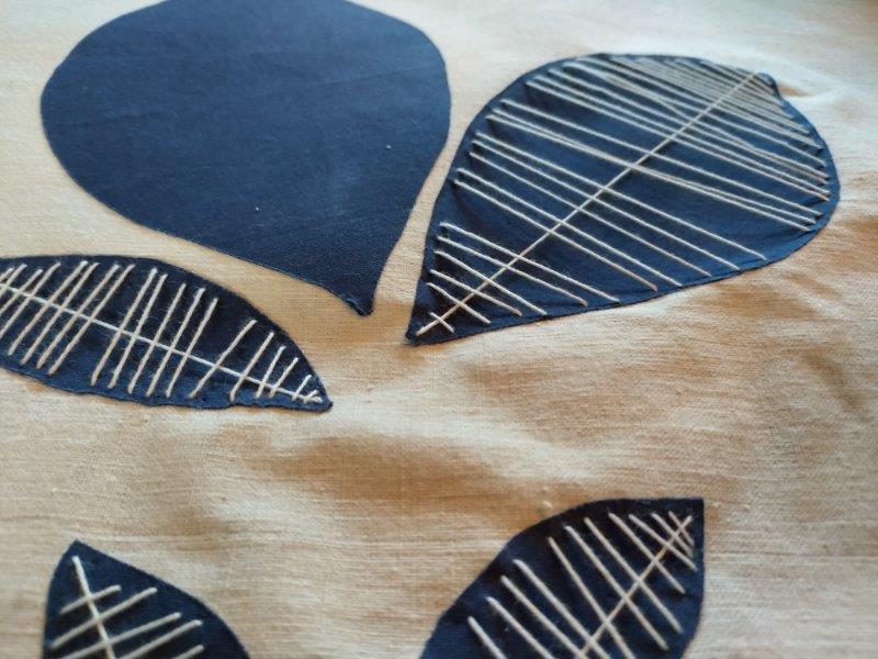 Dafür funkeln ab sofort Blätter und ragen aus Blogs und Instagram-Posts hervor. Wie schön! Der Oktober wird bei Michaela und mir im MittwochsMix herrlich bunt, vermute ich, und ich warte direkt mit blauen Blättern auf. Denn ich habe den freien Tag am Sonntag genutzt, um ein wenig zu sticken und eine Idee vorzubereiten. Und so habe ich zu meiner Lieblingskombi gegriffen: blauer, selbst gefärbter Stoff auf Bauernleinen, dazu Sticheleien in Naturweiß.