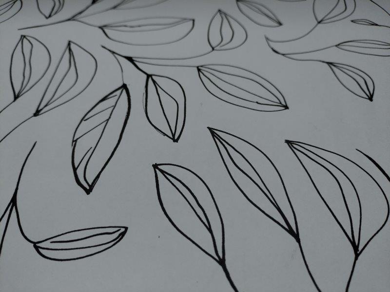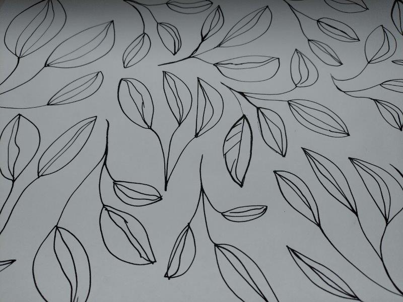 Und letztlich noch ein Blatt mit bemalten Blättern, das vielleicht einmal Geschenkpapier wird, wenn es groß ist – oder Umschlagpapier für ein Büchlein, oder oder….