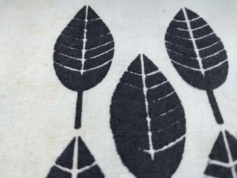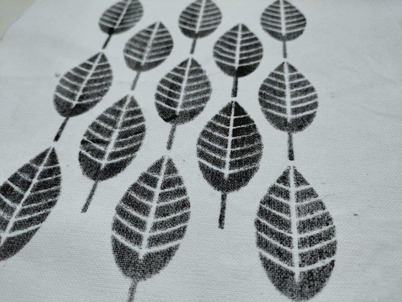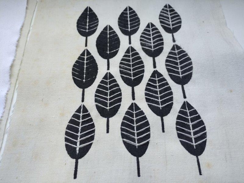 Dann habe ich eine Schablone ausschneiden lassen (Plotter sei Dank) und Stoff bedruckt. Das ging erstmal gehörig schief, weil ich viel zu viel Farbe für diese feinen Blattadern verwendet hatte. Das suppte ganz schön zusammen!