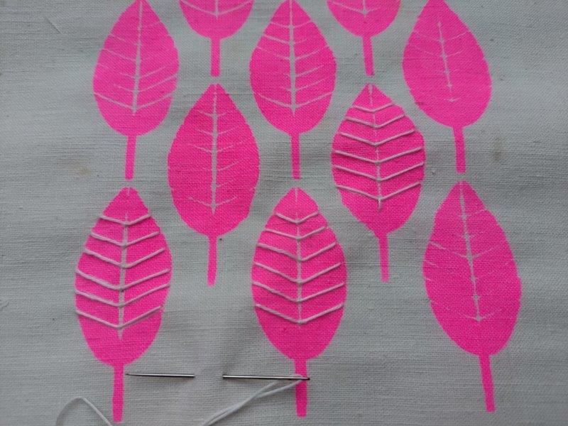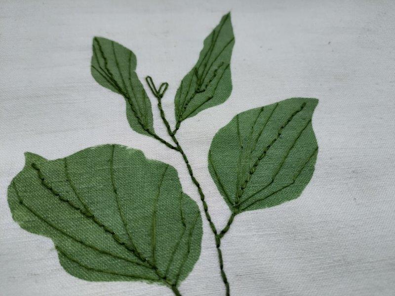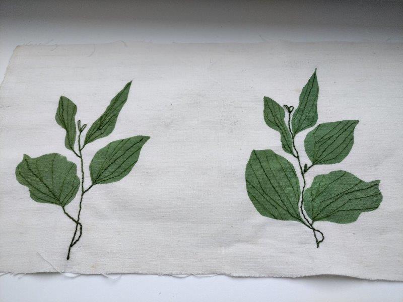 Zunächst einmal gibt es da die gedruckten und bestickten Blätter. Hier habe ich Blattformen als Schablone geschnitten und auf Stoff gedruckt und anschließend bestickt. Gefällt mir richtig gut, und ich denke gerade an ein kleines Rähmchen dafür (alles sieht besser im Rahmen aus, oder?!).