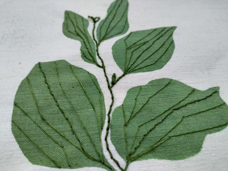 Zunächst einmal gibt es da die gedruckten und bestickten Blätter. Hier habe ich Blattformen als Schablone geschnitten und auf Stoff gedruckt und anschließend bestickt. Gefällt mir richtig gut, und ich denke gerade an ein kleines Rähmchen dafür (alles sieht besser im Rahmen aus, oder?!).