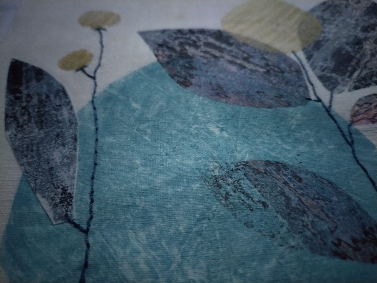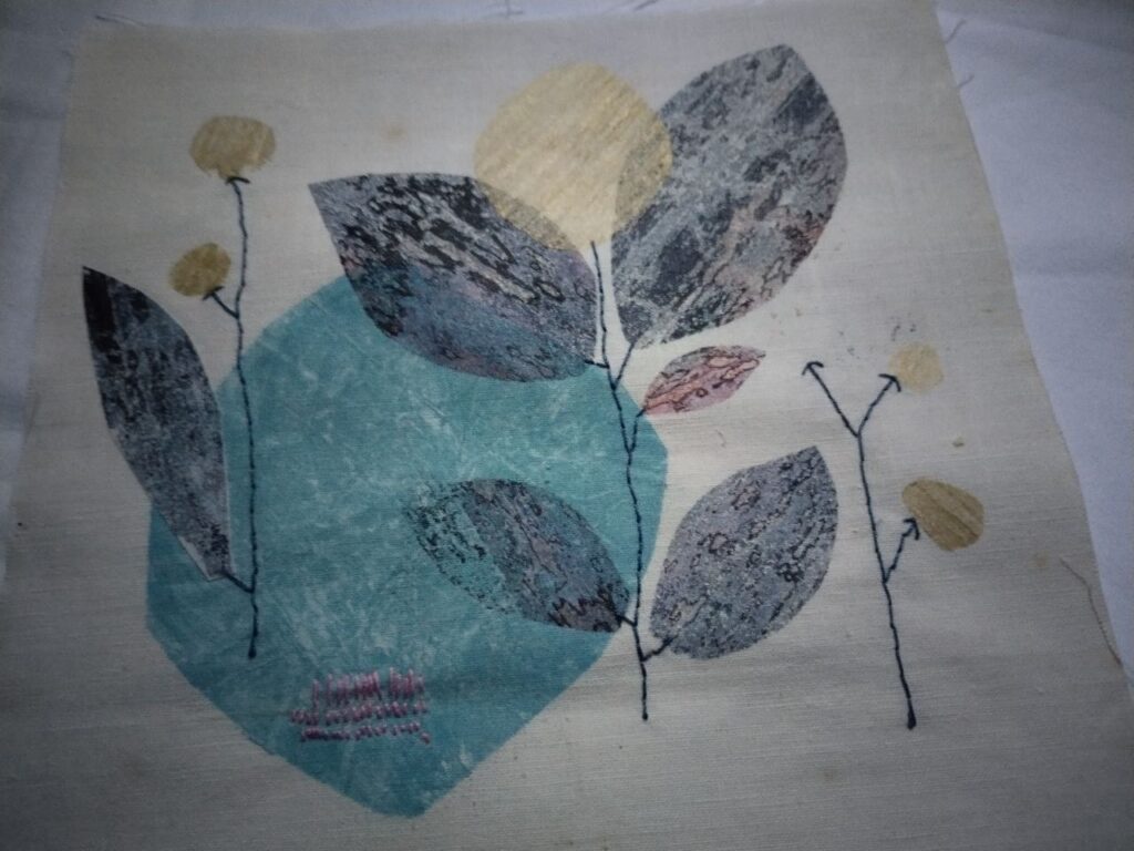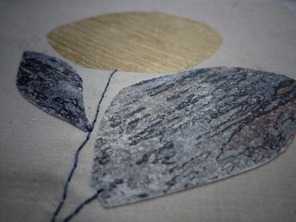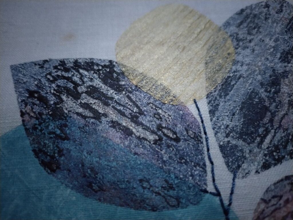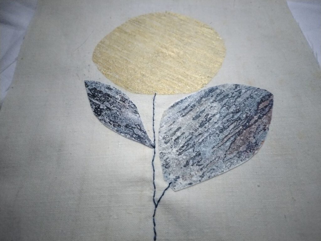 Für die Blätterzerbrechlichkeit – unserem eigentlichen MittwochsMix-Thema – habe ich zwei kleine Stoffstücke mit Vlieseline bebügelt. Das ergibt eine zerbrechlichere Blattstruktur und durch das Gold eine feine Blütenknolle. Im Zug nach Hamburg war gar nicht für das gesamte Konstrukt Zeit, deshalb ist es auch noch nicht fertig. Und hier im Norden war dann keine Zeit mehr für weitere Details.