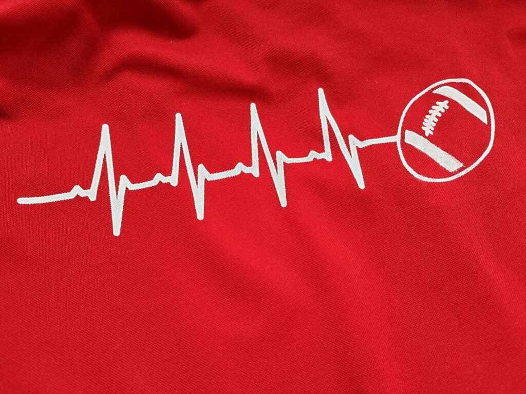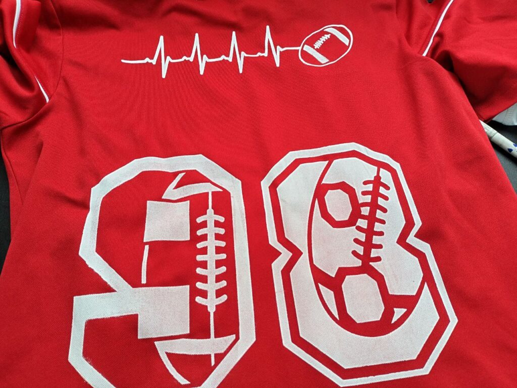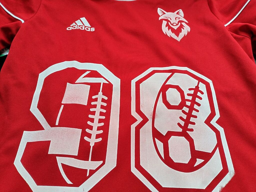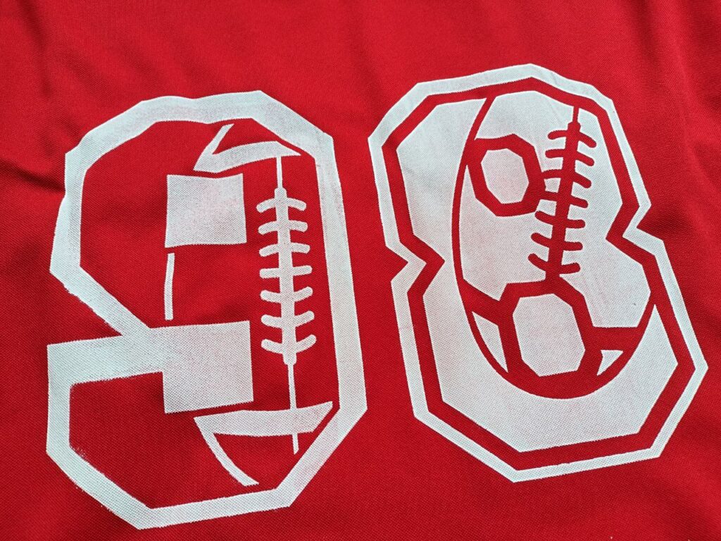 Mich hat das eine kürzliche Siebdruckaktion zuhause mit meinem Sohn erinnert. Er ist gerade sehr im Football-Fieber, und so haben wir T-Shirt mit Zahlen und Co bedruckt. Der T-Shirt-Stoff ist recht grob, deshalb hapert der Druck hier und da. Egal! Sieht halt etwas mehr Vintage aus….