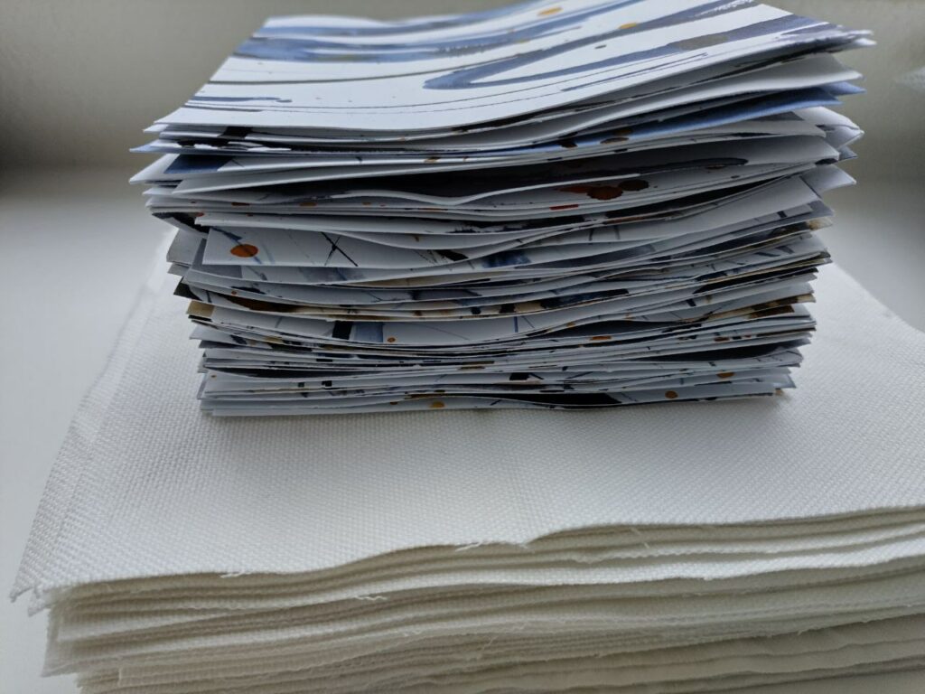 Zusätzlich wird es ein textiles bzw. Mixed Media-Werk geben. Basis dafür bildet ein 15 x 15 cm großes Stoffstückchen, auf dem ich die jeweilige Landschaft abbilden mag – mit Papier, Stoff, Garn, Schrift, Bildtransfer, Druck etc. Was mir so in den Sinn kommt. Alle 52 Stoffstückchen habe ich dafür aus dem gleichen Basisstoff zugeschnitten. Manche Landschaften werden vielleicht genau so groß, bei anderen bildet der Basisstoff vielleicht sogar auch “nur” den Rahmen für ein etwas kleineres Werk.