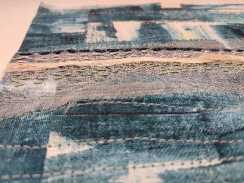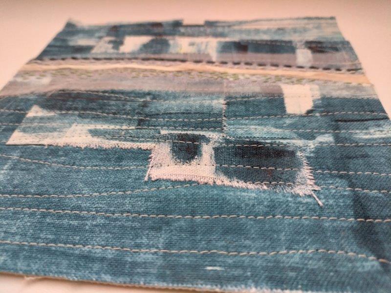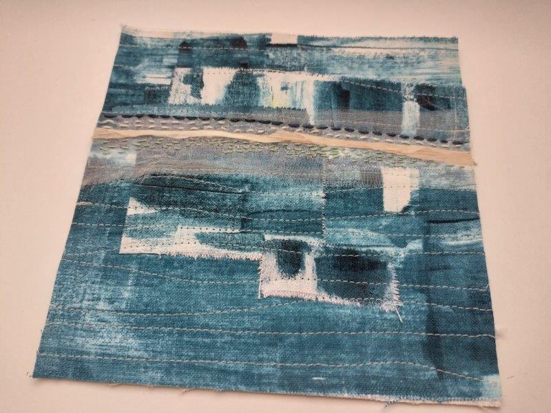 Mein Horizont stellt ein nahezu fließender Übergang zwischen dem satten Blau des Meeres und dem satten Blau des Himmels dar – zu seinen besten Zeiten. Dazwischen ist mal mehr, mal weniger eine Linie, eine Grenze zu sehen. Manchmal denke ich die Horizontlinie auch mehr als dass ich sie sehe. Ich mag dieses ineinander der fast identischen Blautöne, weshalb ich für mich auch die gleichen Stoffe für “oben und unten” gewählt habe. Getrennt durch einen Streifen, ergänzt durch Sticheleien.