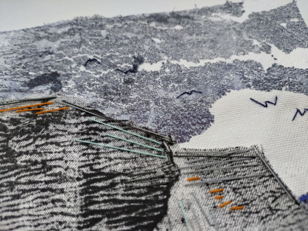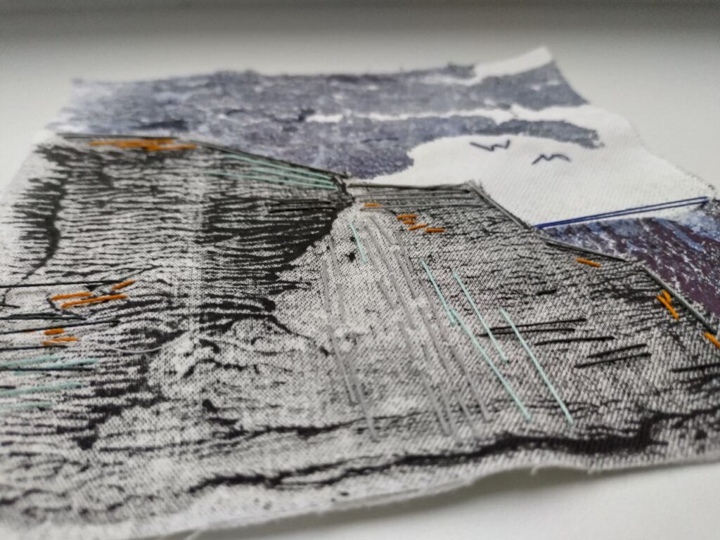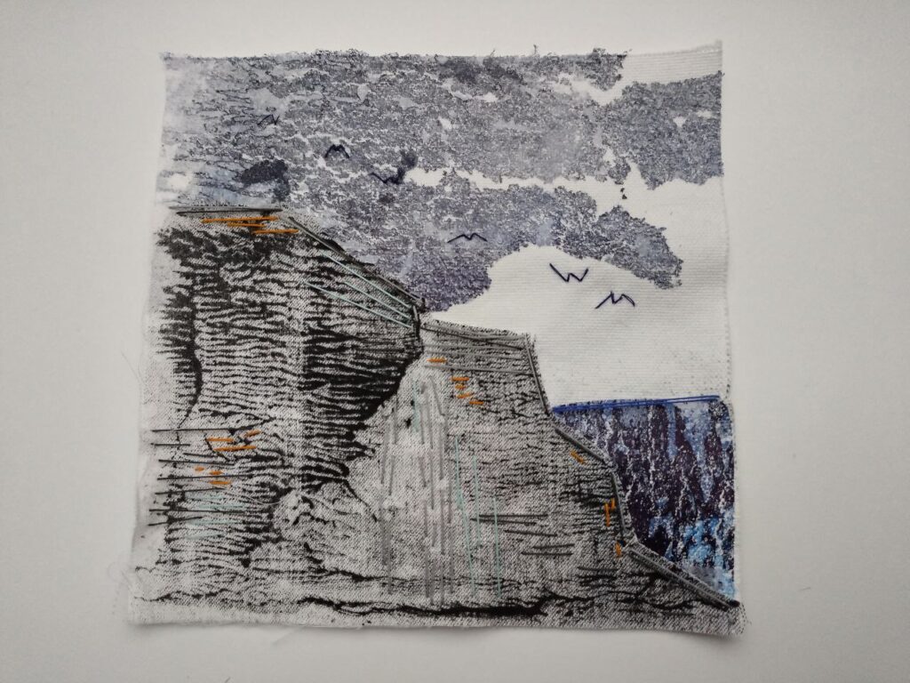 Ich habe mich an einer kleinen Stoffarbeit versucht, die die Felsen recht realistisch abbilden soll. Naja, was ich halt so als realistisch bezeichne. Auf jeden Fall hatte ich ein, wie ich finde, perfekt passendes Stöffchen in Schwarz-Grau, das ich als Felsen vor Wolken und nebst Meer platziert habe. Noch ein paar Sticheleien hier und da. Fertig.