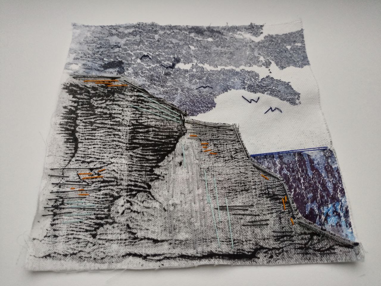 Ich habe mich an einer kleinen Stoffarbeit versucht, die die Felsen recht realistisch abbilden soll. Naja, was ich halt so als realistisch bezeichne. Auf jeden Fall hatte ich ein, wie ich finde, perfekt passendes Stöffchen in Schwarz-Grau, das ich als Felsen vor Wolken und nebst Meer platziert habe. Noch ein paar Sticheleien hier und da. Fertig.