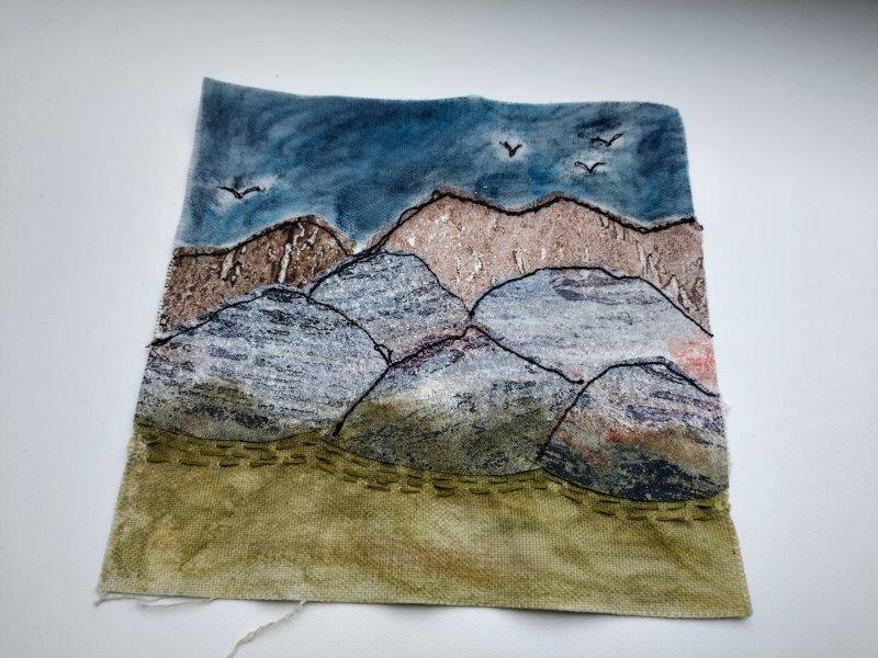 Mein Gebirge kommt in unterschiedlichen Schichten daher: vorne das Grün, hinten das Blau, dazwischen das Steinige. Ein paar Vögel kreisen oben und blicken aus ihrer Perspektive auf das Idyll.