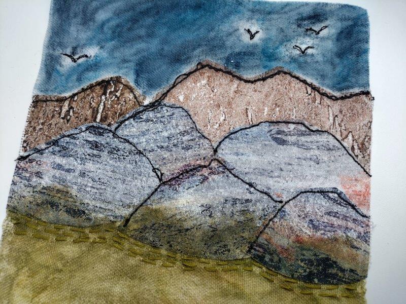 Mein Gebirge kommt in unterschiedlichen Schichten daher: vorne das Grün, hinten das Blau, dazwischen das Steinige. Ein paar Vögel kreisen oben und blicken aus ihrer Perspektive auf das Idyll.