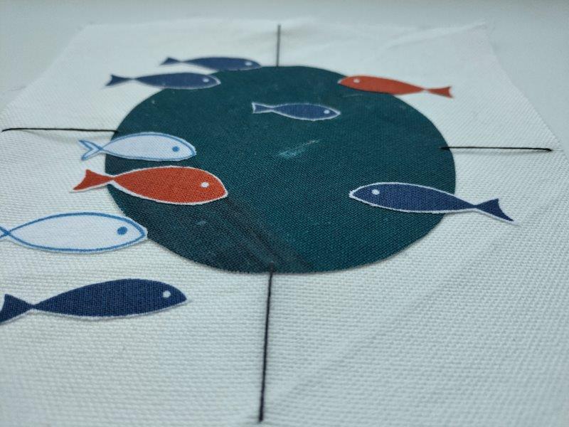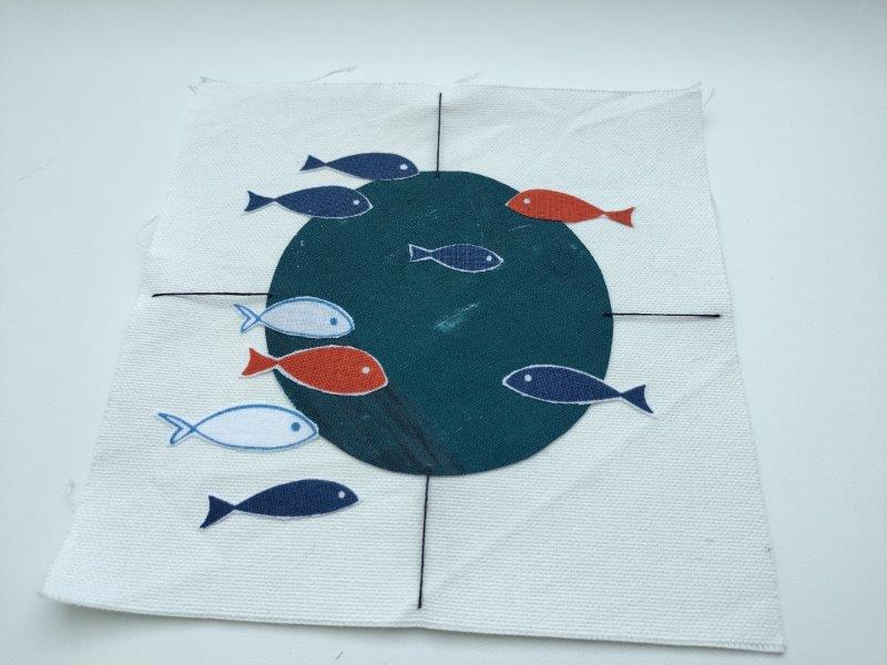 Ich habe mich mit dem Gewicht und der Ruhe beschäftigt als erste der drei kreativen Fragen. Und dann bin ich auch zur Verankerung und dann auch zu Bojen gekommen. Und dann war ich bei der runden Form und wollte unbedingt kleine Fische von einem Reststück Stoff einarbeiten. Und so führte eines zum anderen.