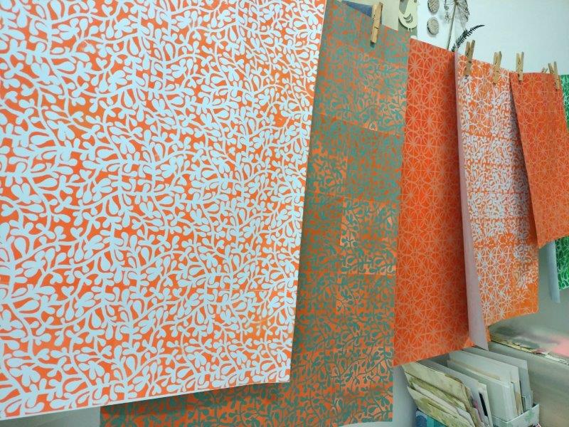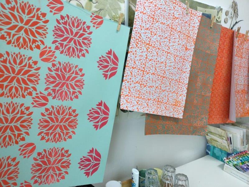 Ich war zu Besuch bei ihr am vergangenen Donnerstag und Freitagmorgen. Und: Wir haben zusammen ein wenig gewerkelt. Ganz wunderbare Papiere sind entstanden – unter anderem mit Orange, aber auch mit viel Pink.