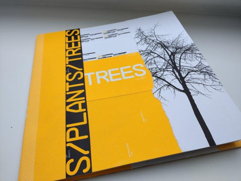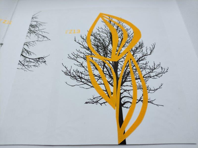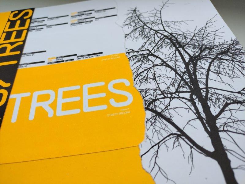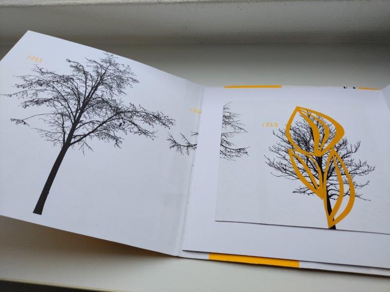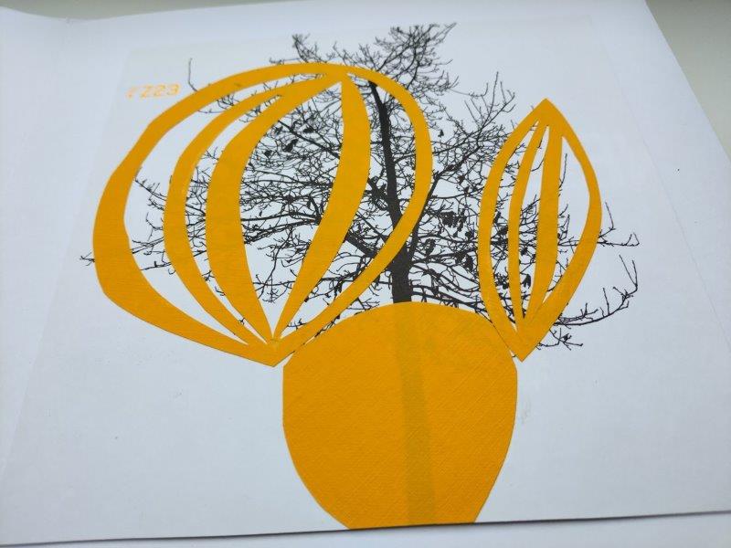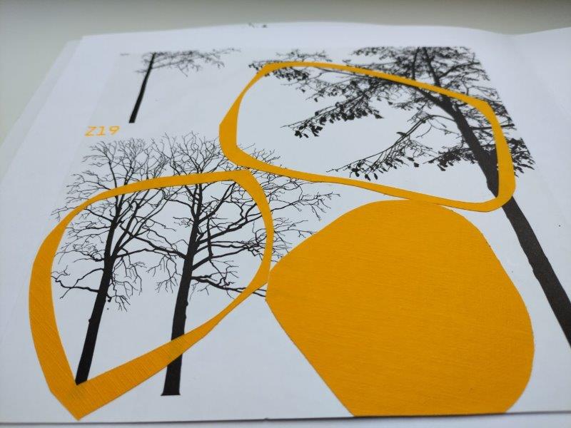 Ich habe aus einem alten Buch mit vektor-basieren Illustrationen einige Baumseiten gerissen. Die Seiten sind genial, denn sie kommen bereits mit ein wenig Orange daher. Über die Bäume habe ich dann orangefarbene freie Kreisformen, oder ausgeschnittene Papierformen geklebt. Viel mehr ist da gar nicht dran, doch mit dem Schwarz und Weiß und Orange knallt das so richtig und hat mir große Laune bereitet.
