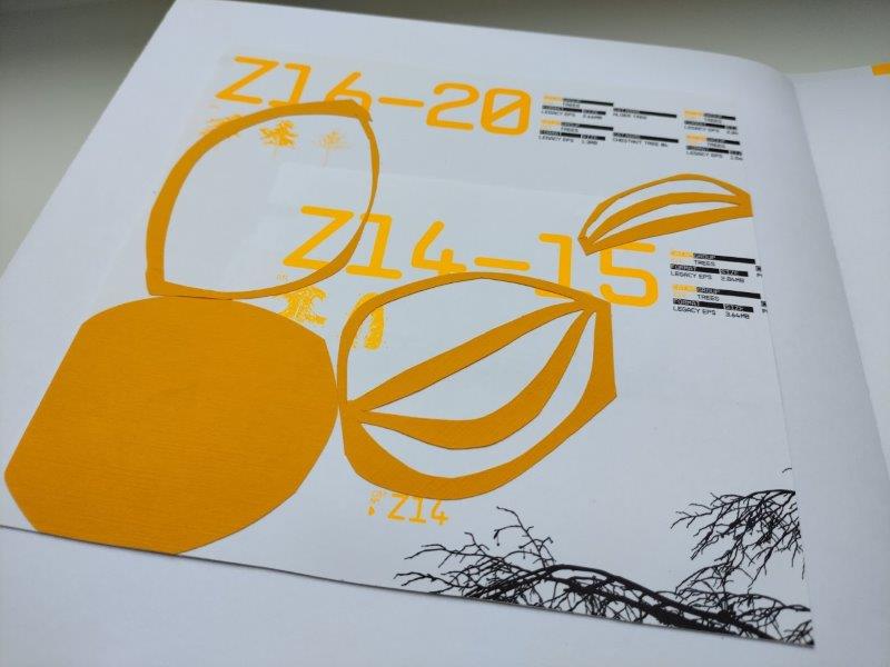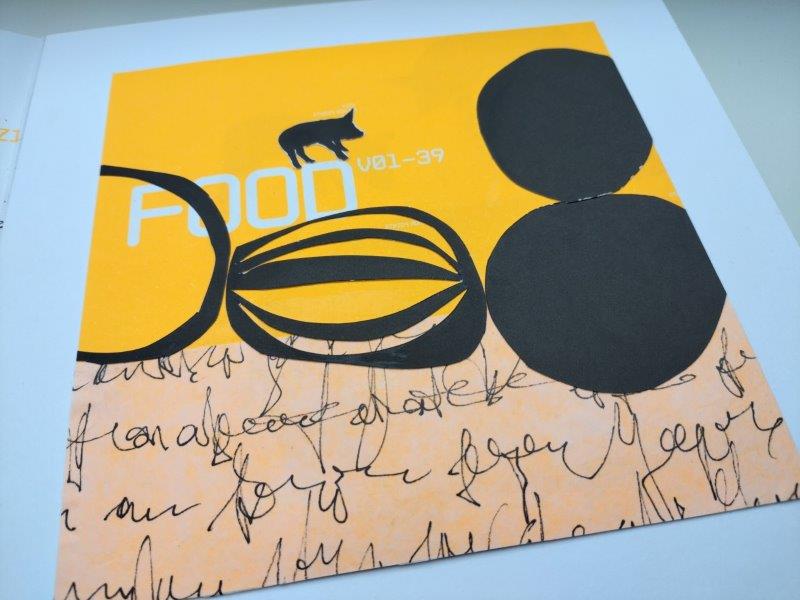 Und so ist Seite für Seite entstanden. Auch ein orangefarbenes Papier aus dem Buch war dabei, das dafür schwarze Formen aufgeklebt bekommen hat.